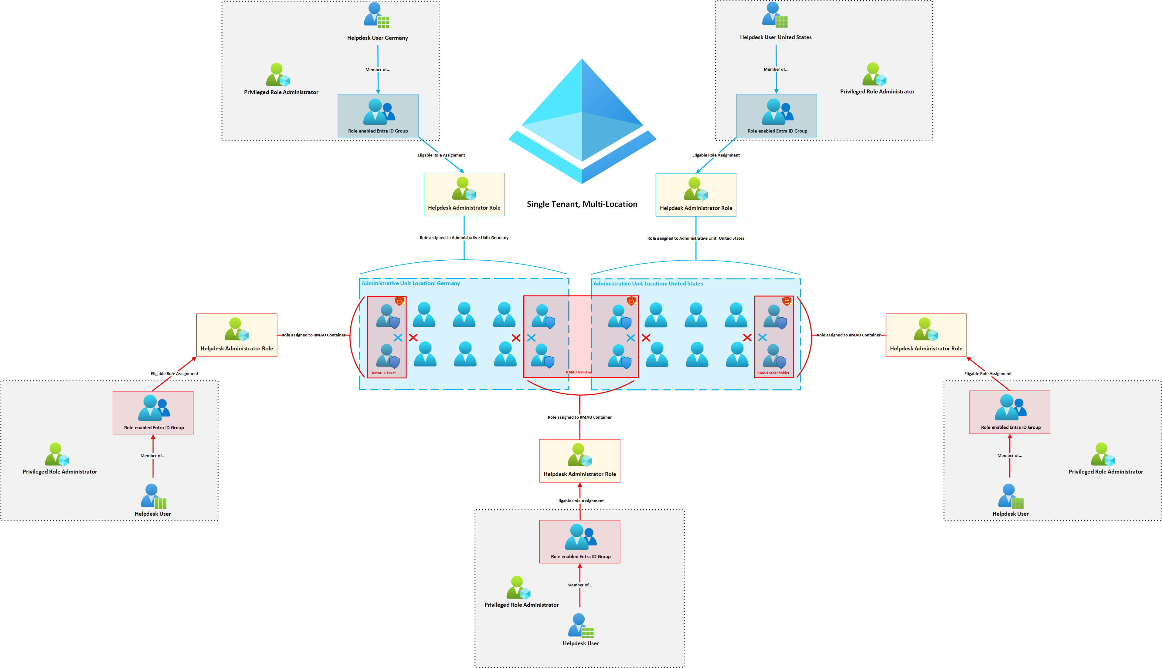 Administrative Units und Restricted Management Administrative Units spielen zusammen ihre Stärken im “Enterprise Access” aus, um Zugriffe auf Ressourcen nach dem Least-Privilege Prinzip zu ermöglichen. Das nachfolgende Architekturbild soll dies am Beispiel des Helpdesk-Szenarios beschreiben für eine Single-Tenant Multi-Geo-Location Unternehmen zeigen.