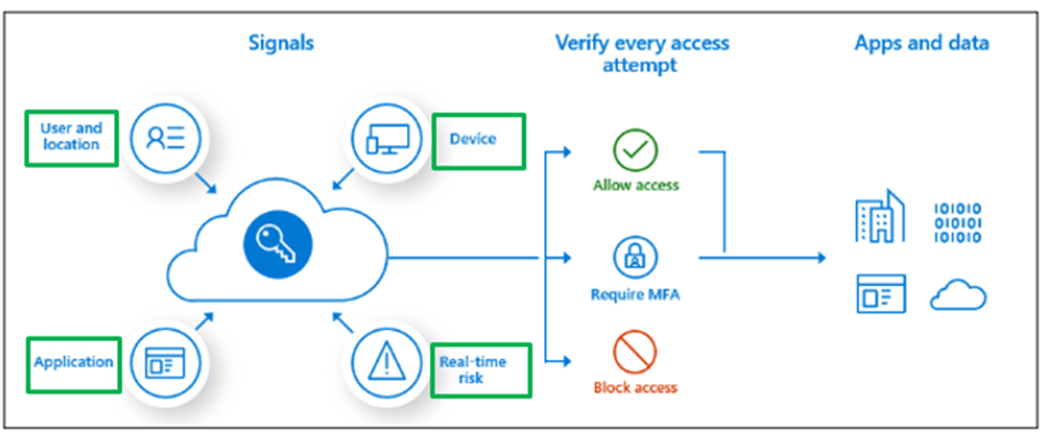 Durch die Auswertung dieser Signale kann sichergestellt werden, dass nur autorisierte Identitäten unter definierten Bedingungen auf Ressourcen zugreifen können.