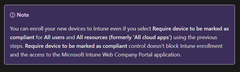 First of all, Microsoft noted, that you don’t need to exclude “Microsoft Intune Enrollment”, if your conditional access policy enforce device compliance and is scoped to “all resources”.