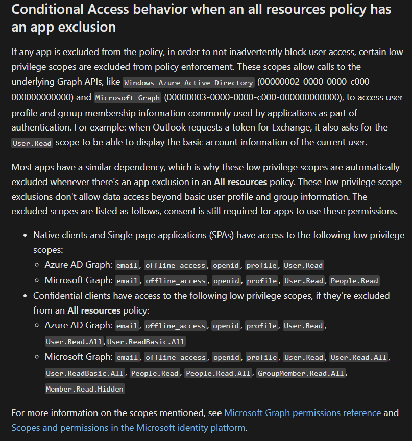 There is another caveat when using exclusion in your policy and target it to “all resources”. In this case, you also exclude several low privileged scopes: