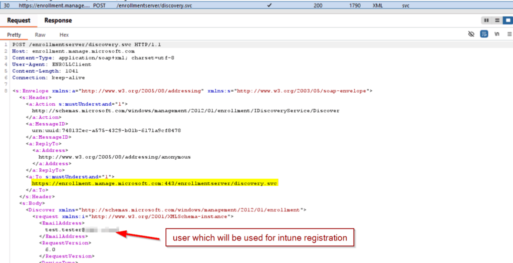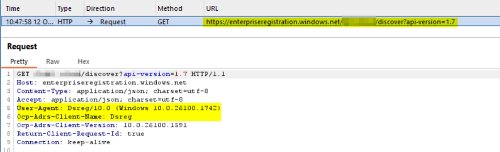 This is the MDM discovery call from the Windows Enroll Client (ENROLLClient) to Intune. It is part of the start of MDM registration (after successful device registration/DRS) and queries which enrollment and policy endpoints your tenant should use.