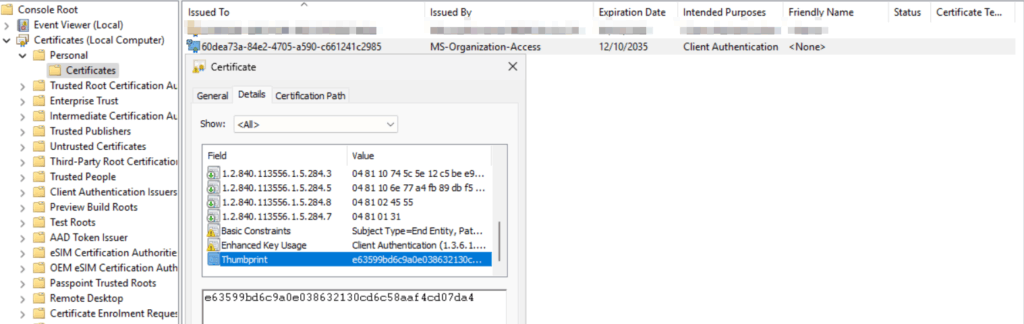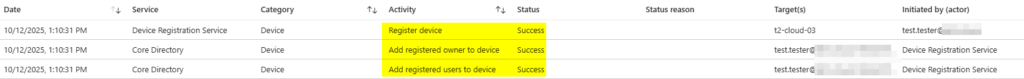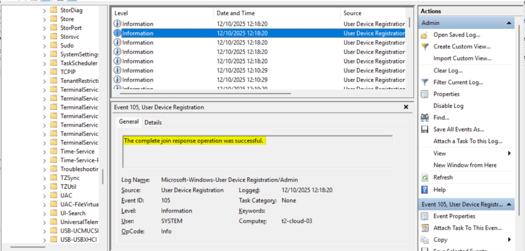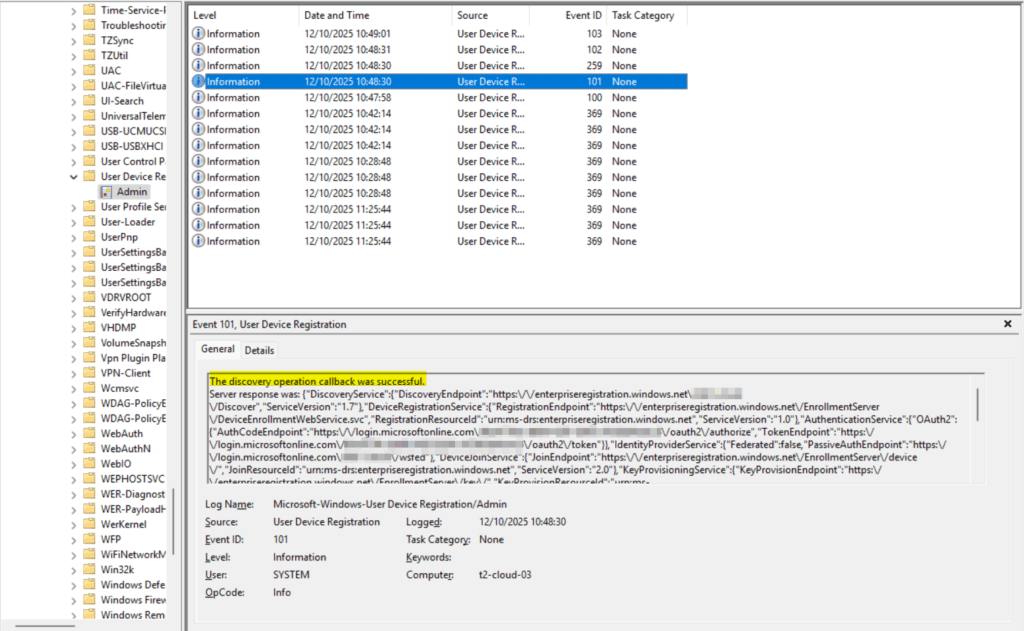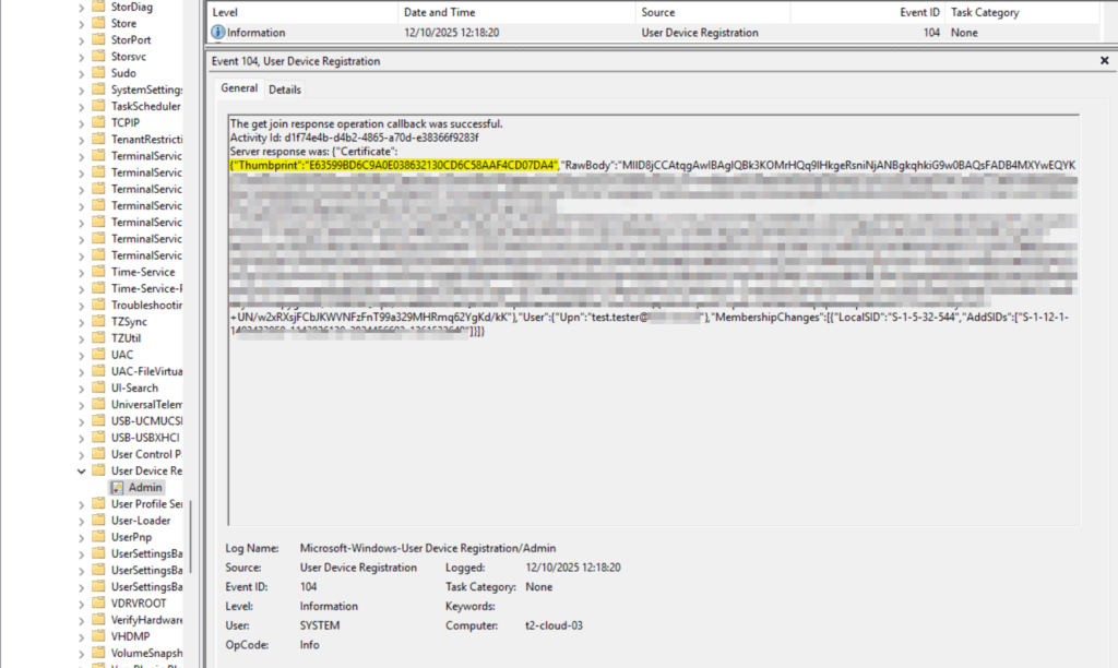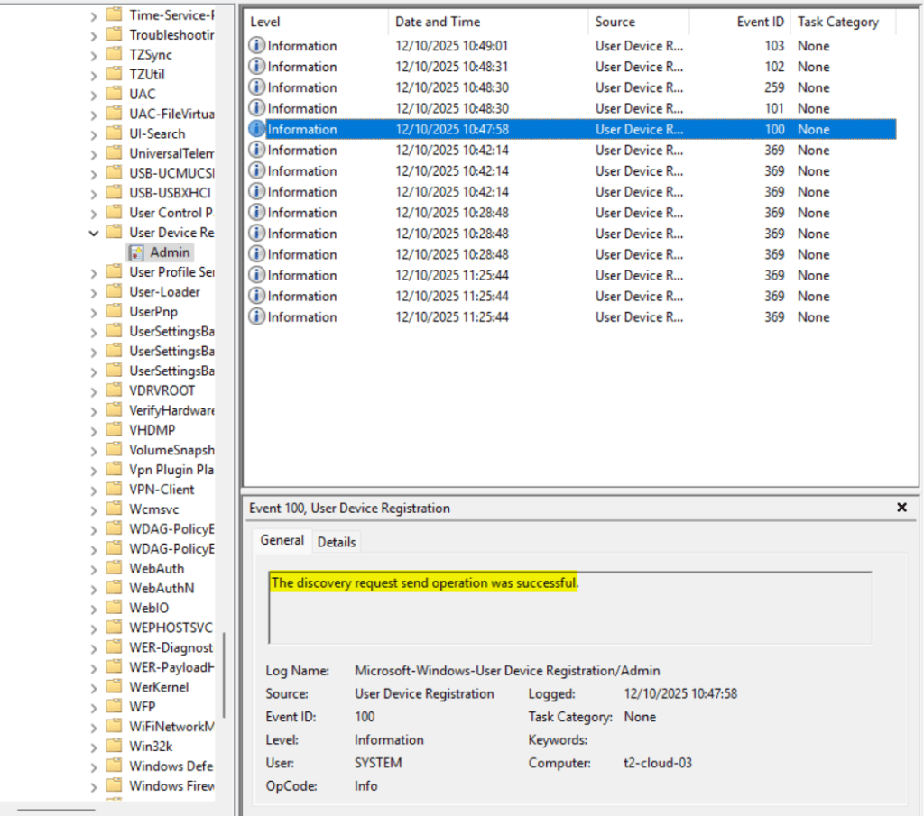 Corresponding event log entry: Microsoft\Windows\User Device Registration\Admin