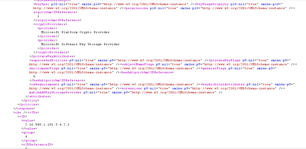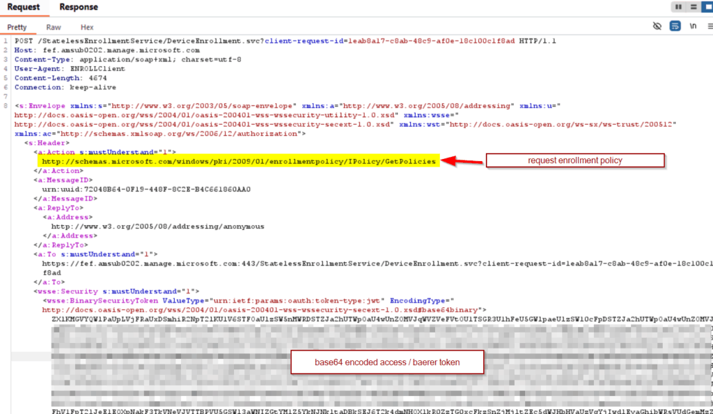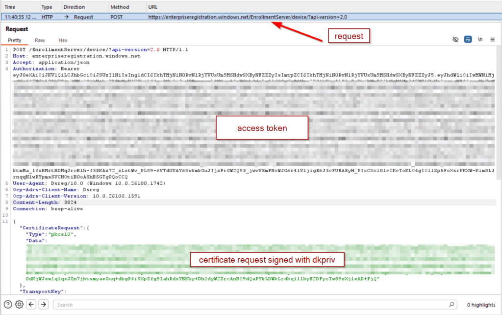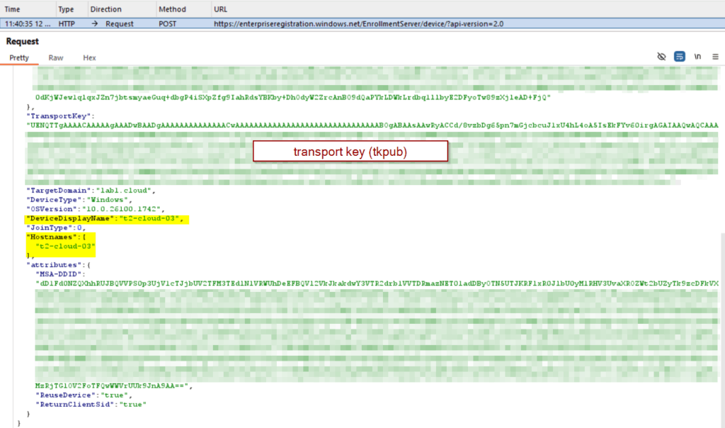 Just afterwards the device registration endpoints are discovered, the application (dsreg) creates a TPM bounded RSA 2048 bit key pair (known as device key [dkpub/dkpriv & transport key [tkpub/tkpriv]). Additionally, dsreg initiate a PKCS device certificate request using dkpub and dkpriv, signs the request with dkpriv. The device certificate is used for a long-term device authorization. The requests consists of