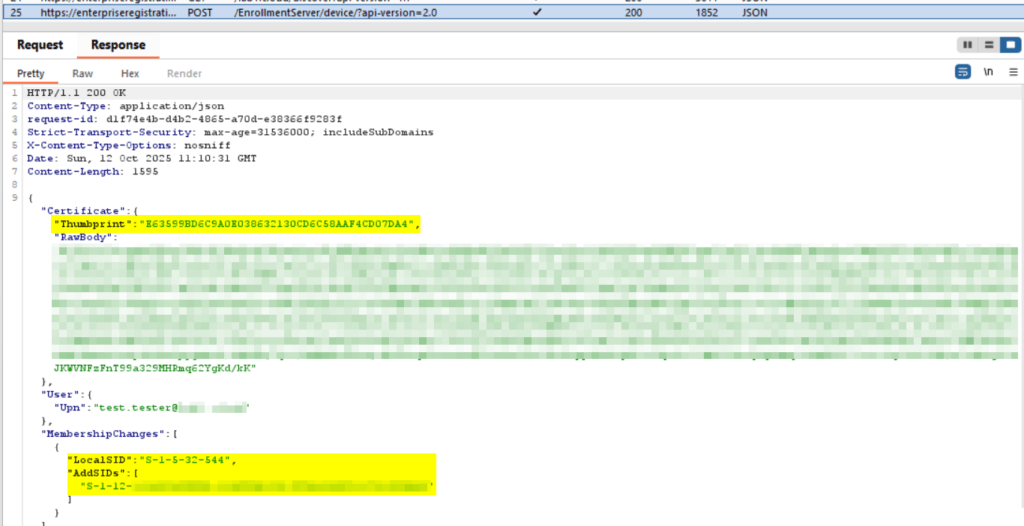The device registration is completed when device id and the device certificate are received from the device registration service. Additionally, If you have not configured that your registration user should not be a member of the local administrator group, the user is assigned to the local administrator group identified by the well-know SID: S-1-5-32-544.
