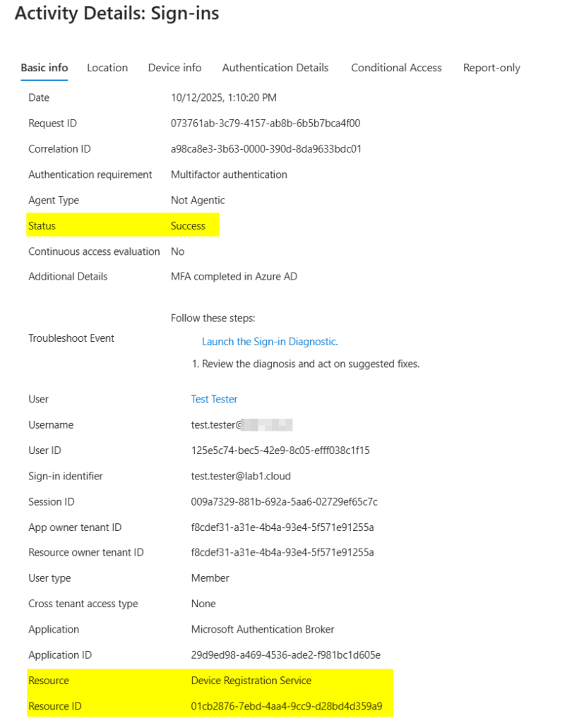 A this point, the first steps of device registration were completed successfully and our device is entra joined although there is a conditional access policy in place which enforce device compliance for all resources.
