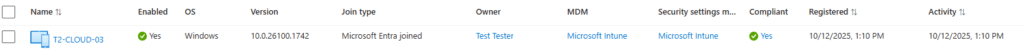After the device was enrolled successfully, the assigned compliance policies were deployed and the compliant state appears.